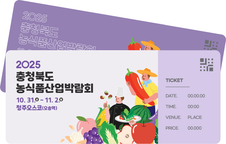 Tel. 043-230-9700 Ⅰ Fax. 043-236-9110,9150Copyright ⓒ 충청북도농식품산업박람회 All Rights Reserved.
